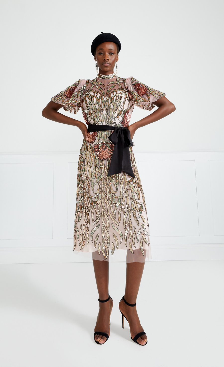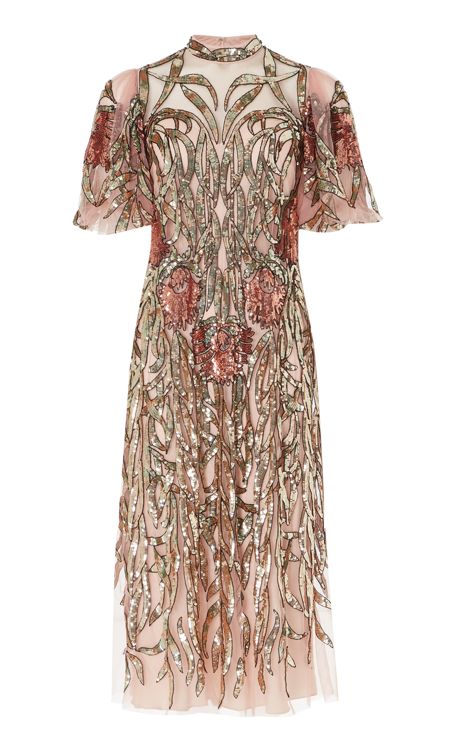 Tessellating, folding sequin foliage frames the figure to form this embellished cage-like effect on the soft Italian tulle that looks as though the embroidery is floating over the body. The graphic Uzbek florals weave into the enveloping leaves and are also used to border and line the body, to further the flattering effect of the painstakingly engineered embroidery. The dress is a perfect elegant choice, but please note it has a loose fit.