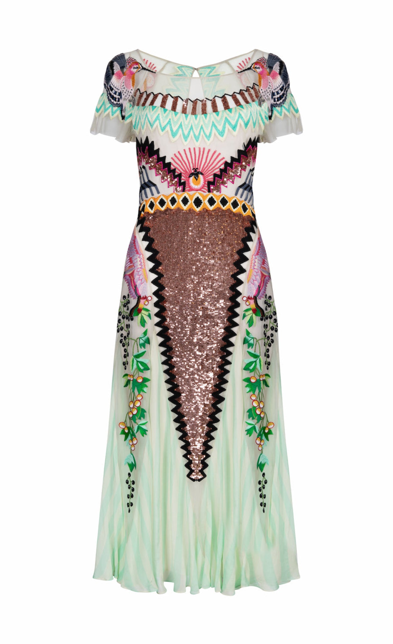 The Talia Dress is crafted from the softest Italian tulle and adorned with striking embroidery and sparkle. Exquisite stitch work, detailed appliqué and shimmering sequins form decorative, gilt-edged columns and cornices interspersed with hummingbirds, classical Grecian grapes and twisting vine leaves. Printed chiffon godets, a sheer neckline and delicate, gauzy sleeves complete the glamorous look.