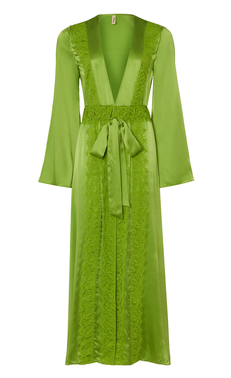 The Thalia robe features a delicate lace trim for texture and allure, with full-length sleeves and a deep V-neckline. The rich green satin silk skims... More.