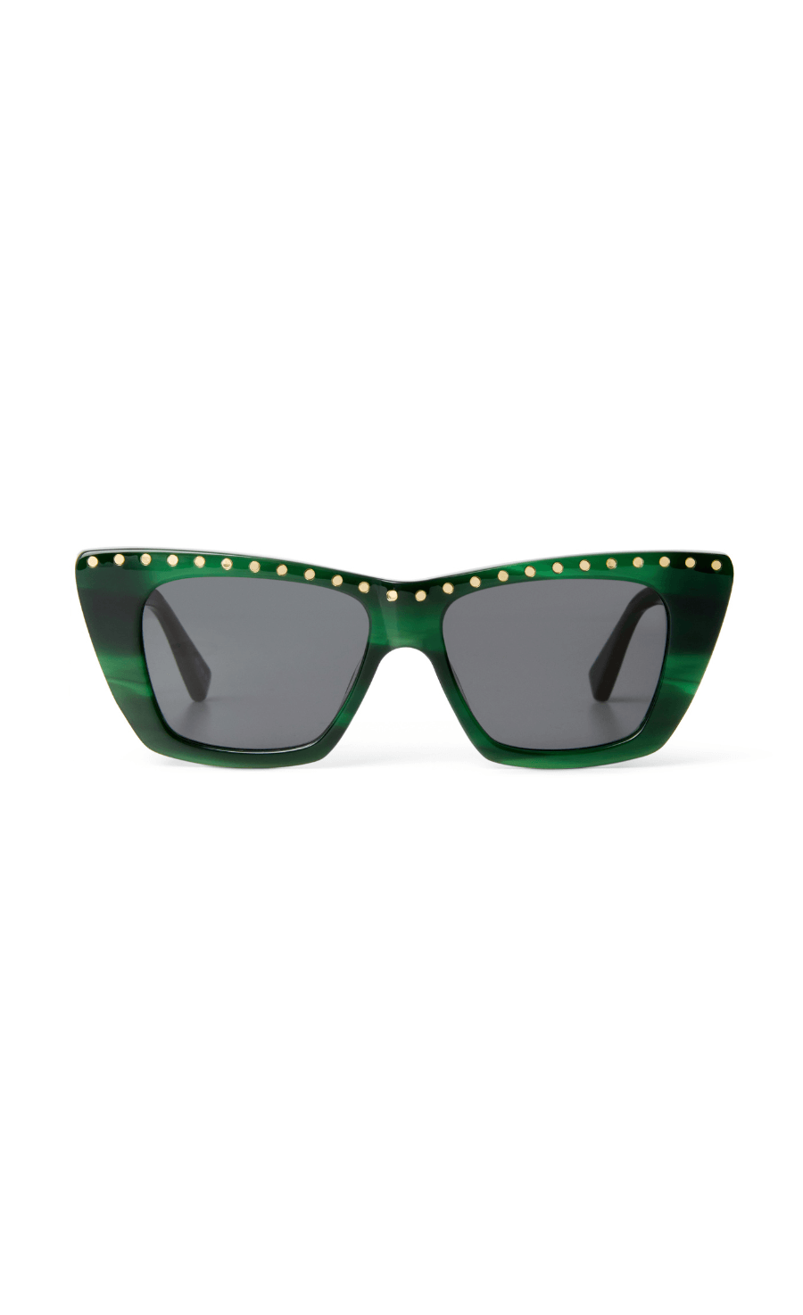 The Dolly is a reworked classic. A shape that Alice has always had in her personal sunglasses arsenal, the cat-eye is the ultimate silhouette for achieving retro glamour. Adorned with flush gold studs across the upper frame, the Dolly is both feminine and bold with a decadent Temperley touch.