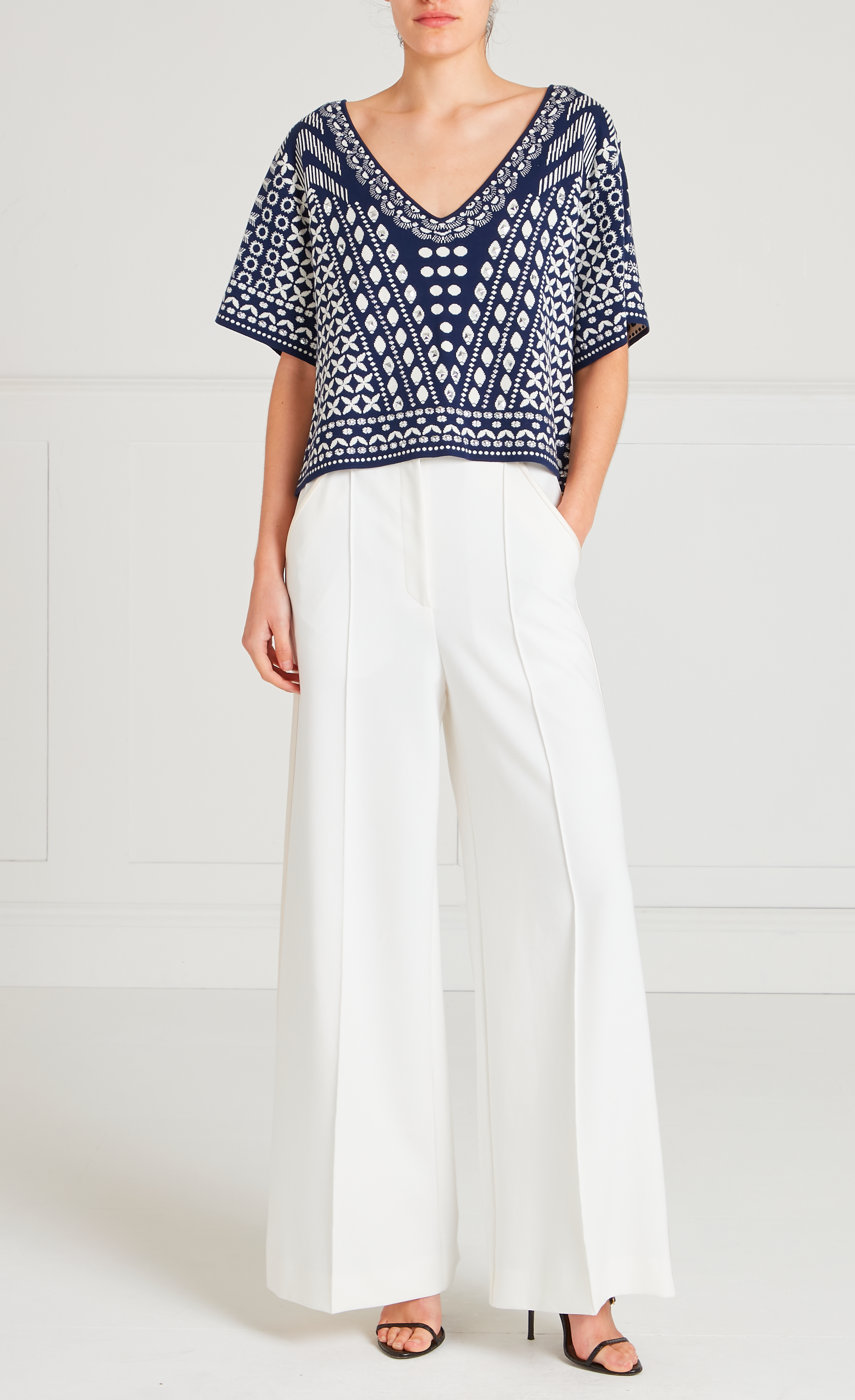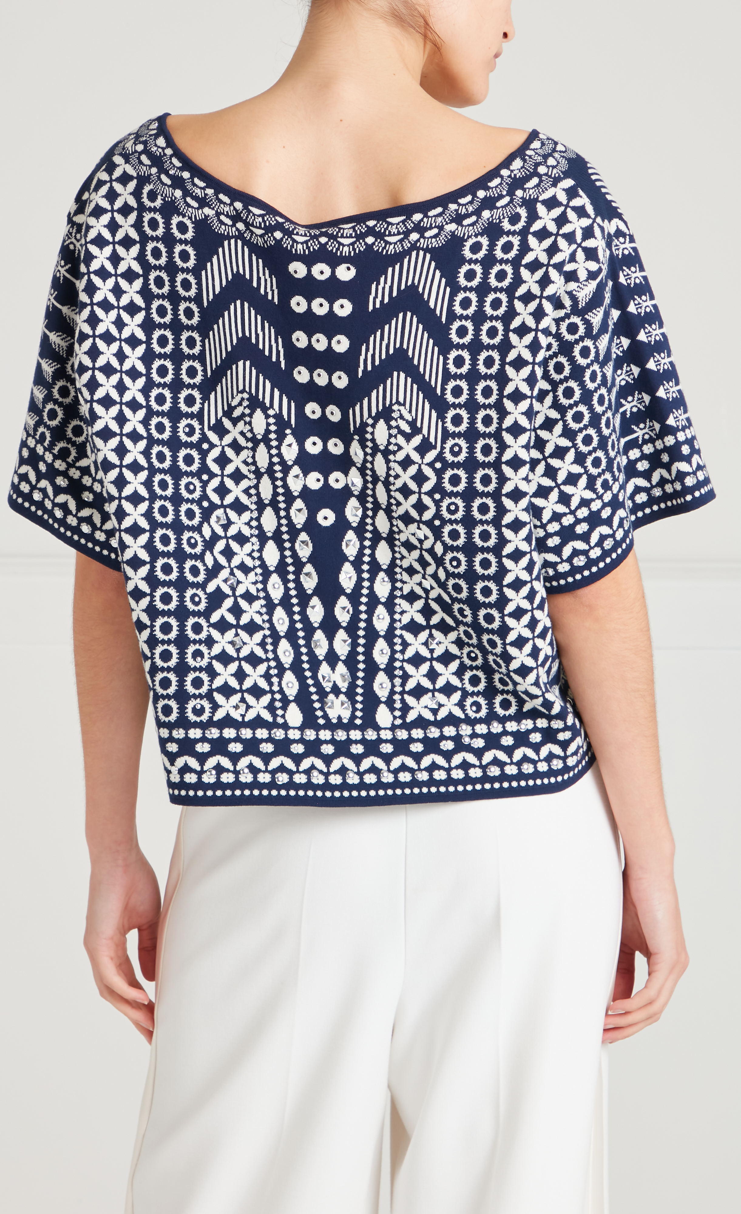 A V-neck and relaxed fit give this navy and silver cropped top a sense of movement and flair. Both casual and intricately patterned, it features... More.
