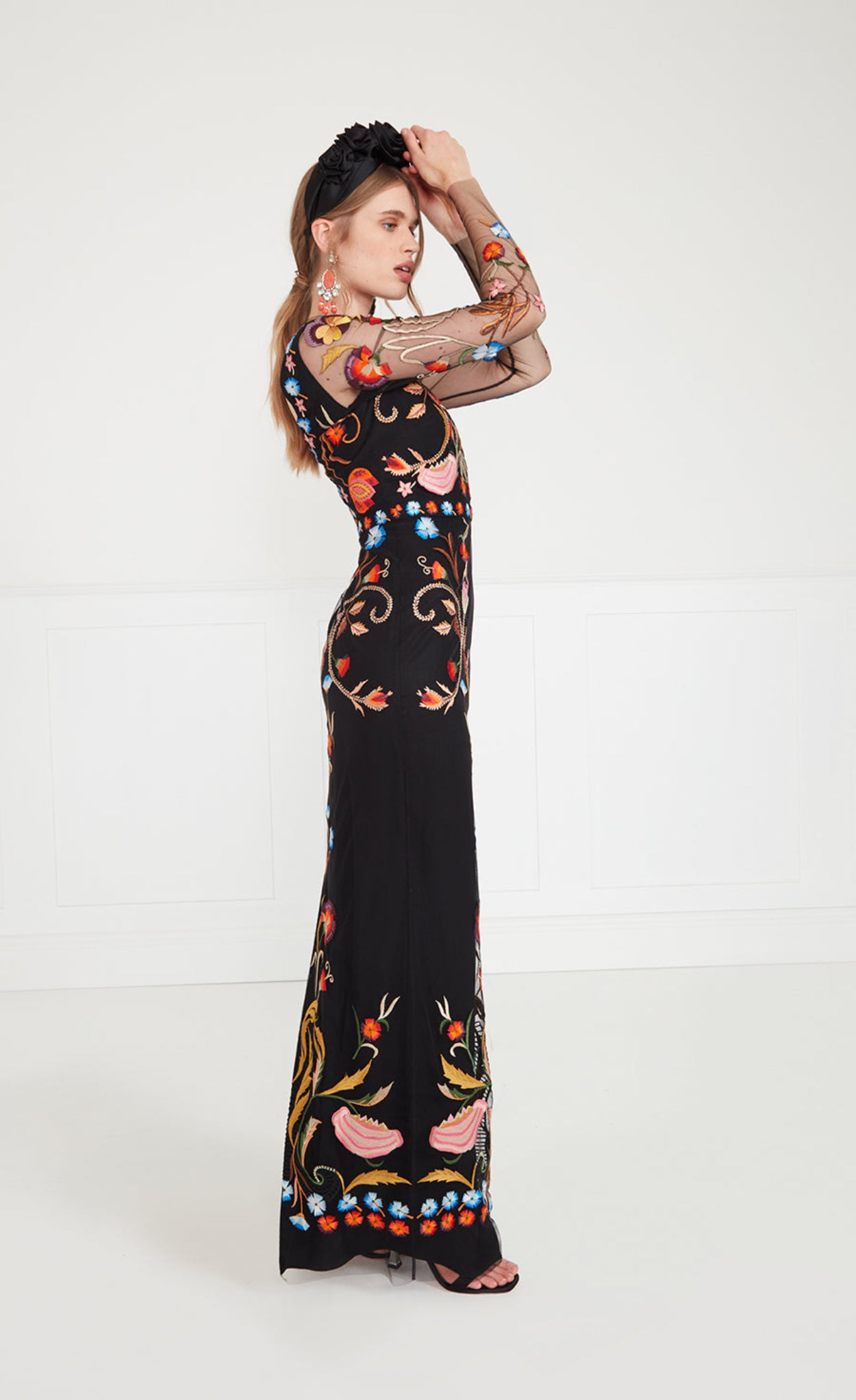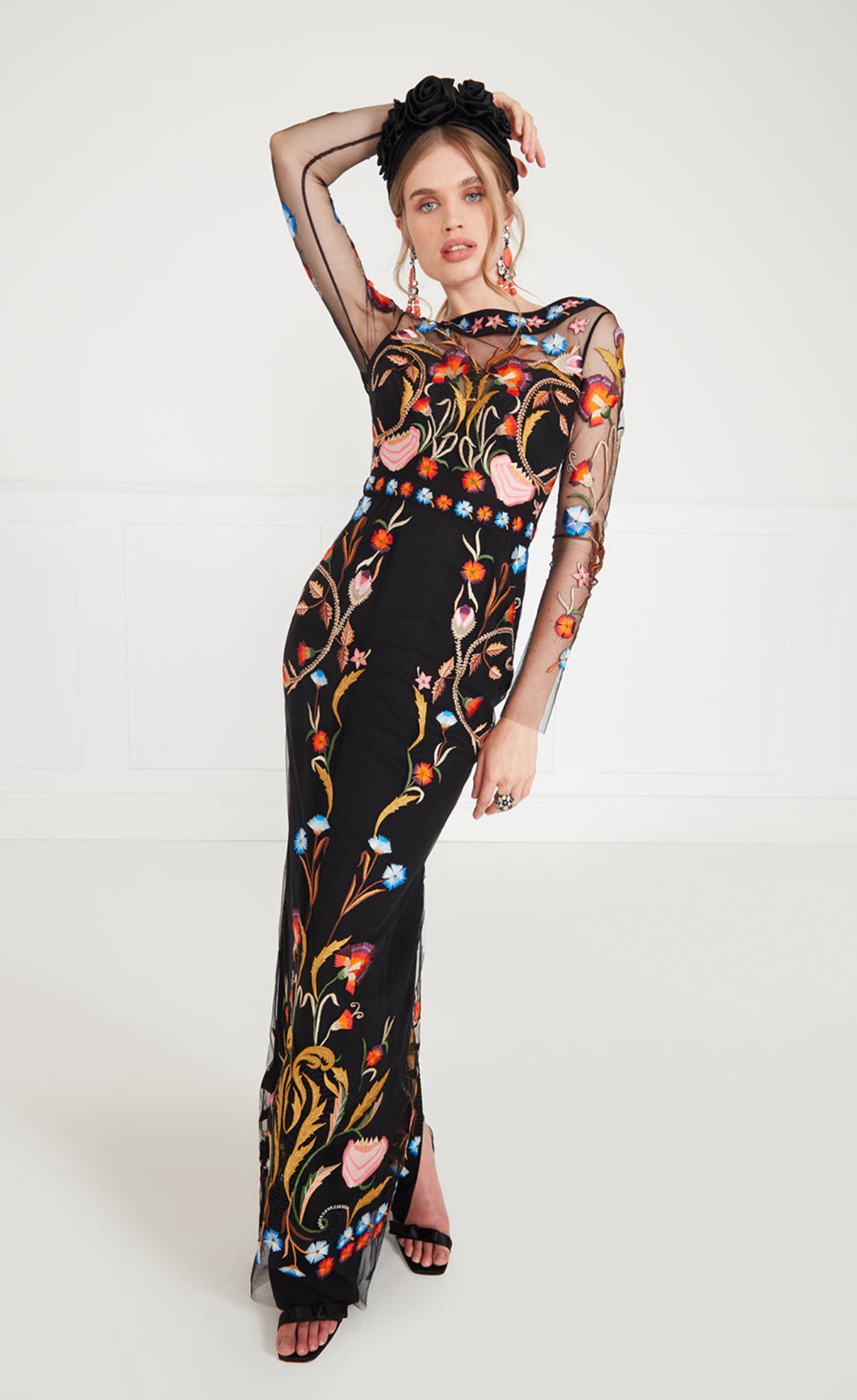 This beautiful floor-length gown features delicately hand-painted florals in euphorically bright colours, creeping over sheer tattoo sleeves towards a nipped-in waist and slim fitting, floor-length skirt. A dress for the dreamer within.