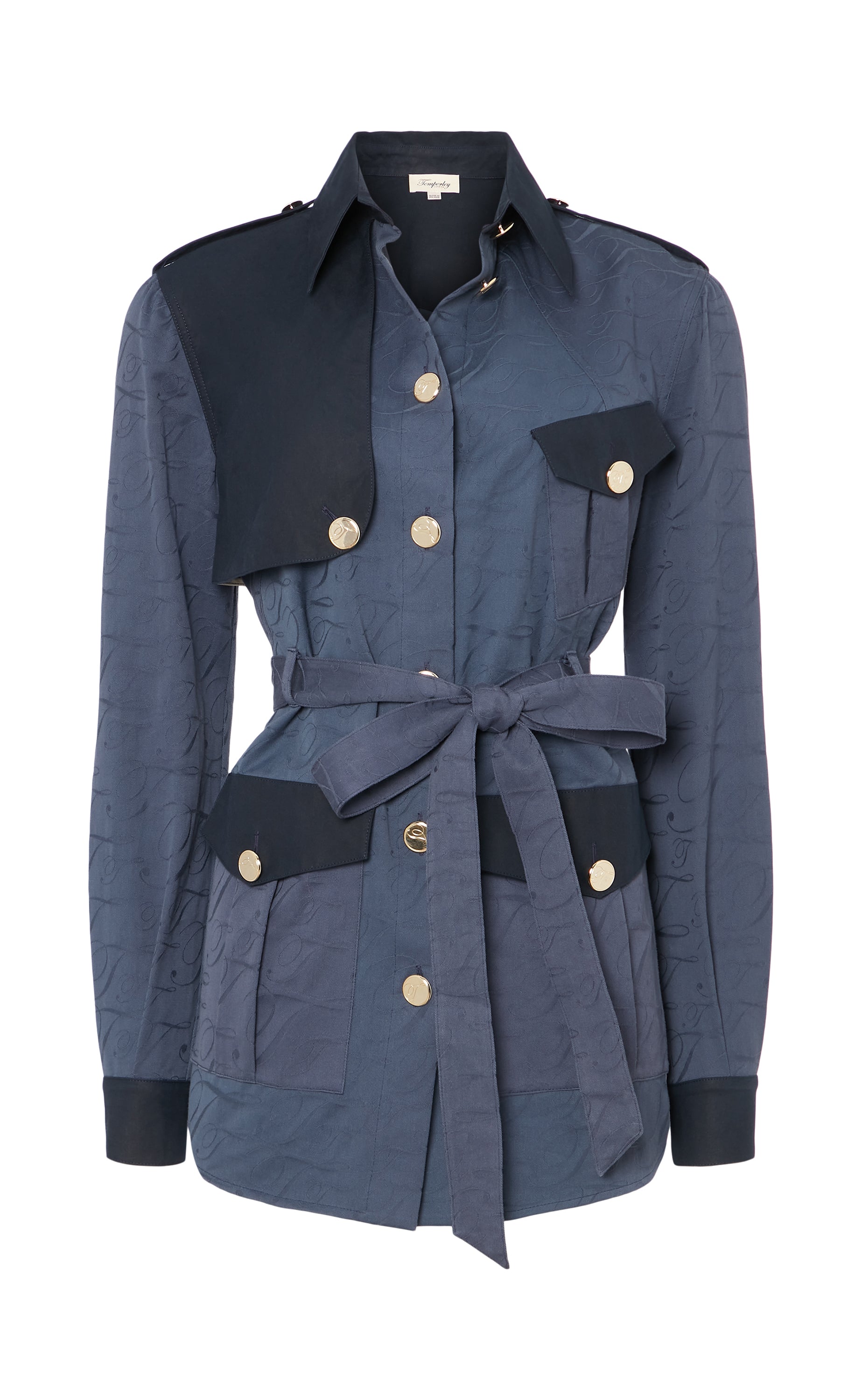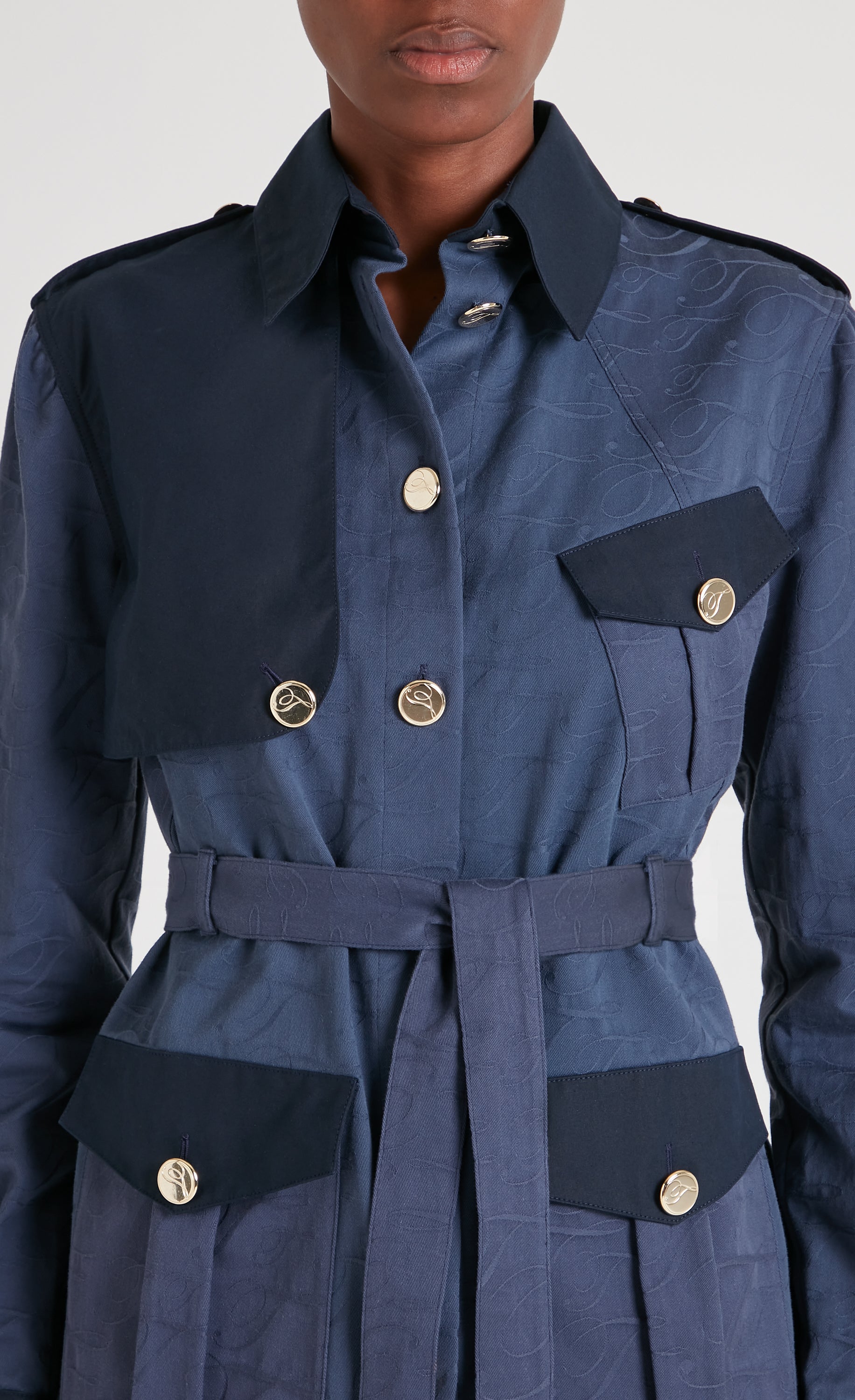 Sharply tailored, this blue structured utility jackets bring modern refinement to functional design. Gold buttons add a polished touch, while multiple pockets emphasise functionality in... More.